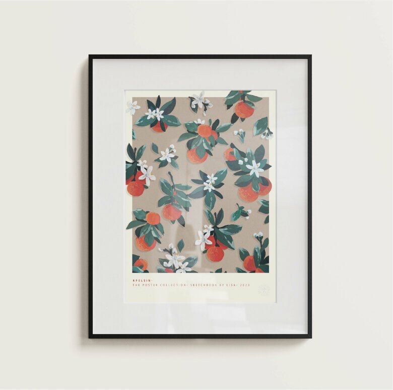 Poster med apelsiner, med inspiration ifrån Spanien.