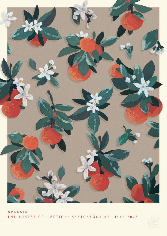 Poster med apelsiner, med inspiration ifrån Spanien.
